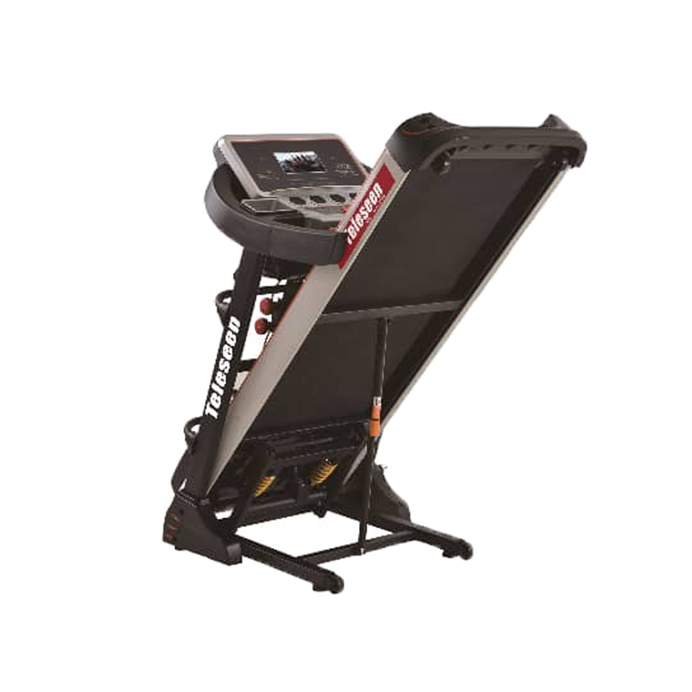 Teleseen Treadmill with 0-15% Auto Incline, 2.0 HP motor, home uses strong build and foldable Treadmill. Teleseen Treadmill TMS 900 DS user weight is 120 Kgs., moving wheels to move the Treadmill easily. Comes with two big springs under the running desk to reduce the shock, End cap lubrication system, with MP3, USB input, and an LCD Display.